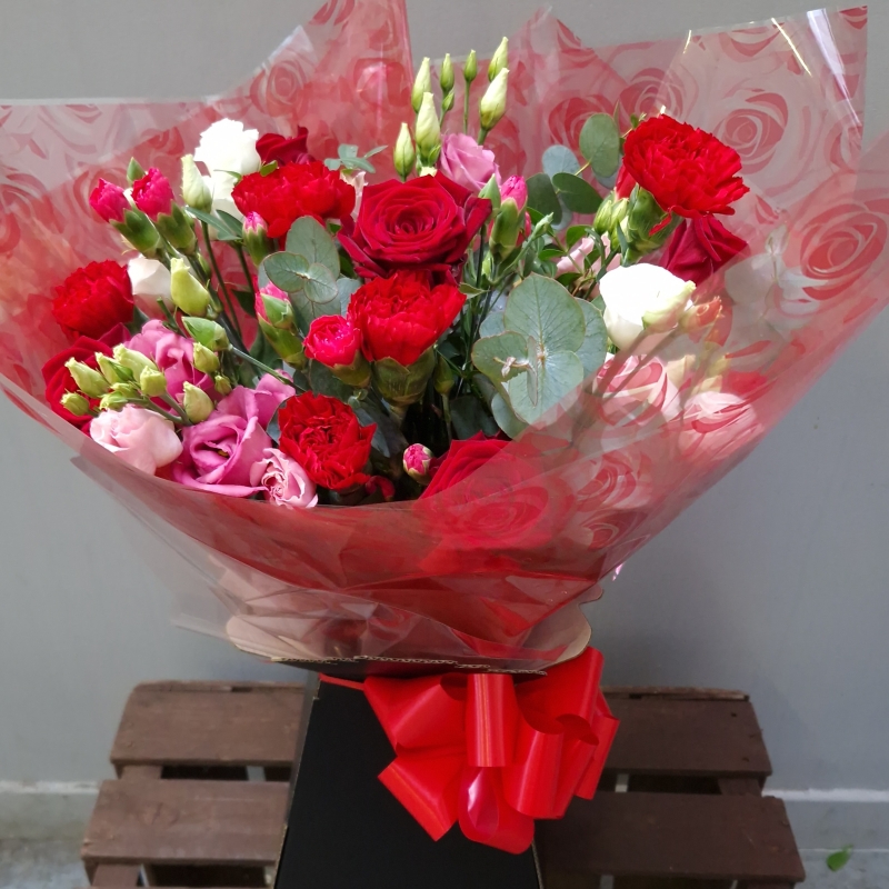 a beautiful combination of Roses, Lisianthus and Carnations.