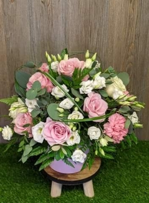 A beautiful arrangement in soft pink and cream flowers which include roses and lisianthus
