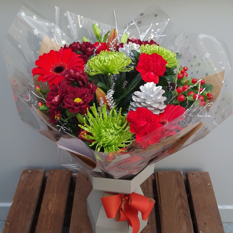 A beautiful bouquet of reds, greens and a touch of silver